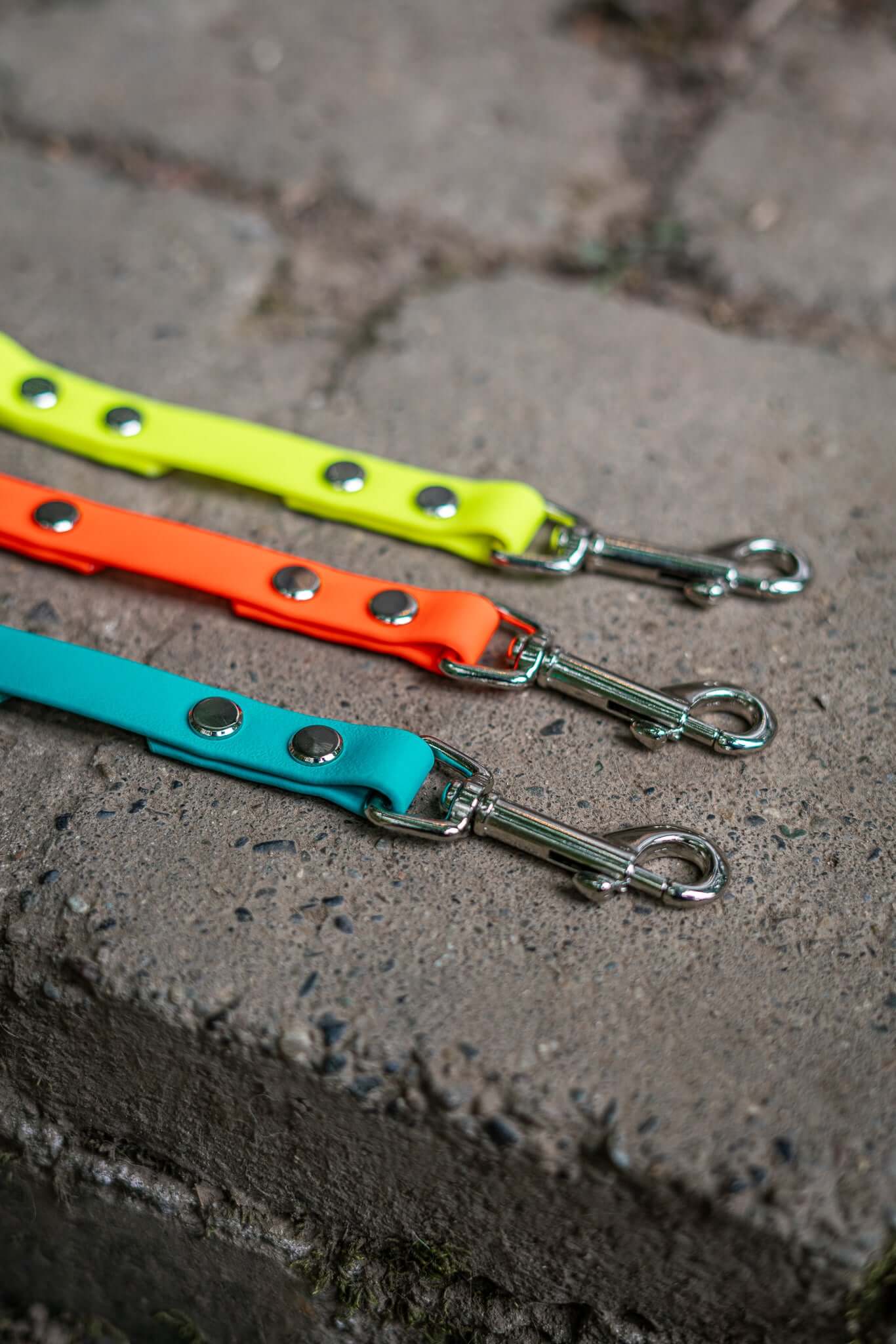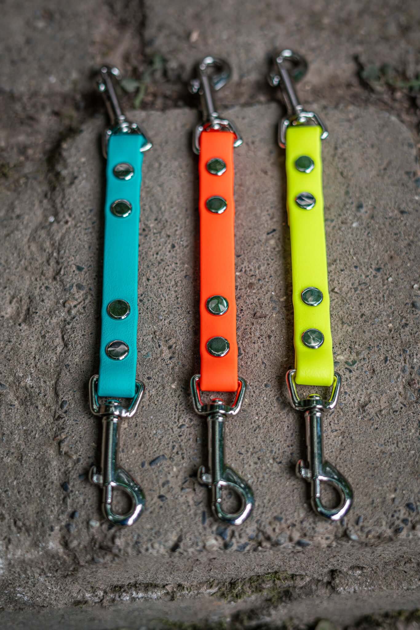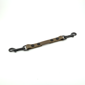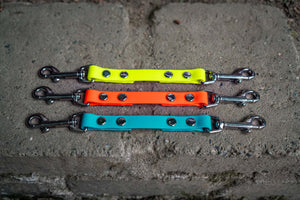 Our safety connectors come standard with 5/8" genuine Beta BioThane®. There are three hardware options available: silver standard, black standard, and solid brass (as an upgrade). We offer several different lengths with 8" being the minimum and standard length option.